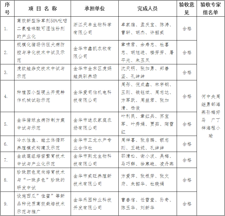 金華市級科技計劃項目驗收結(jié)果公示清單